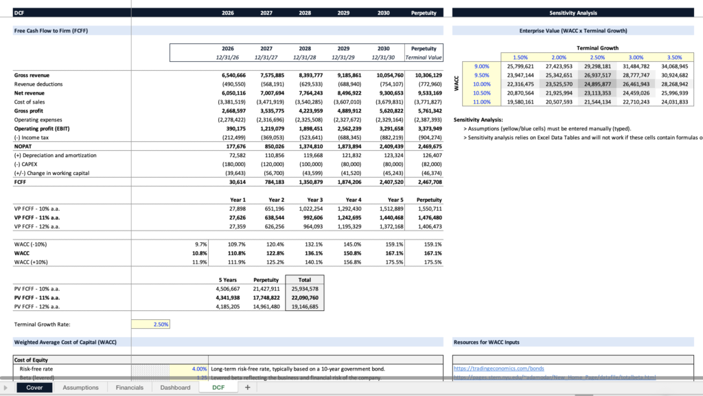 Projections, valuation, cash flow, balance sheet and KPIs are computed automatically.
