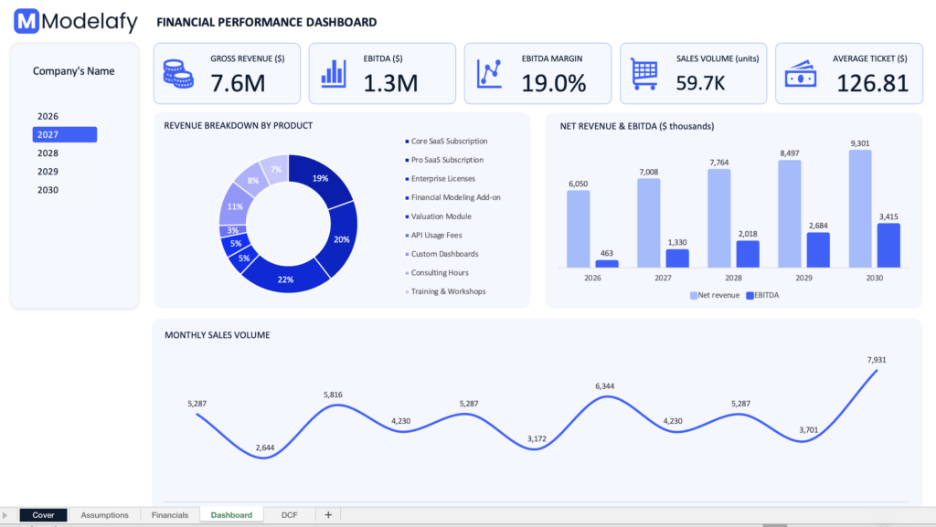 Fill a few assumptions and instantly get integrated financial statements, valuation, and an interactive dashboard.