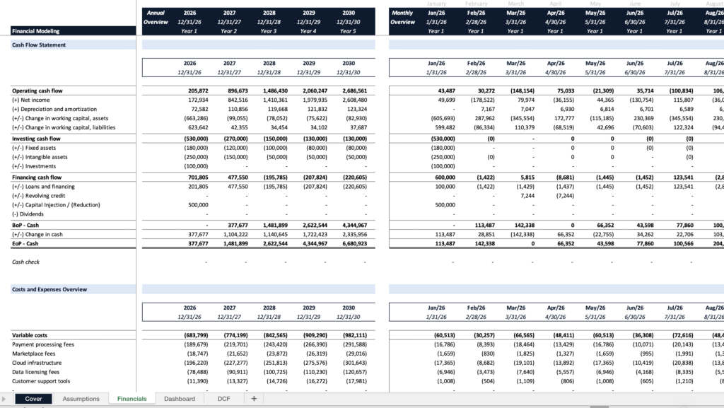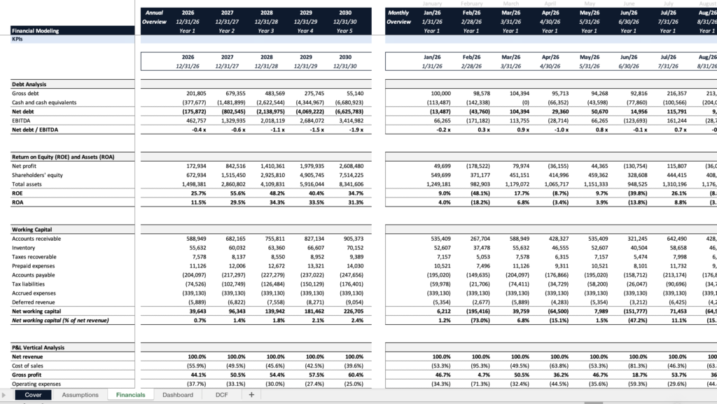 Automated Income Statement, Cash Flow and Balance Sheet, plus integrated analysis and a dynamic dashboard — all in one smart spreadsheet.